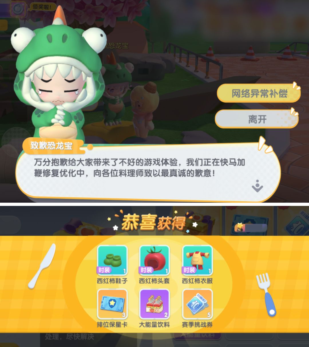 我们已在游戏内为大家准备了版本体验优化补偿一份,请料理师们更新补丁后前往王国广场-NPC【致歉恐龙宝】处领取补偿礼盒,领取后在背包中使用即可。(补偿内容:西红柿时装*1,排位保星卡*3,赛季挑战券*5,大能量饮料*2。)