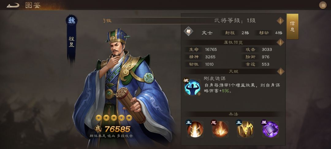 法师推荐:程昱或者李儒,程昱在普通橙将中输出不低,并带有携带BUFF就能变强的被动,叠高层后输出非常爆炸,李儒是群雄的稀有将,获取难度较高,不过输出能力爆表,而且技能范围极大,并且附带各种减益BUFF,推图能力非常强