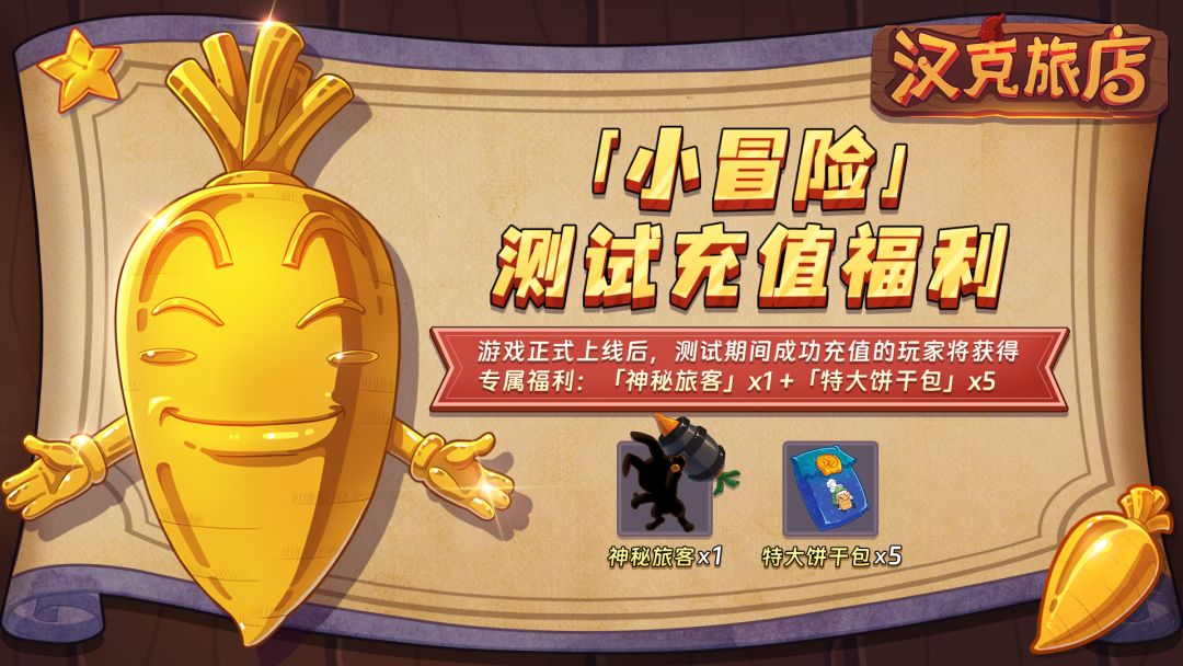 「小冒险」测试期间,成功充值的小勇士将会在游戏正式上线后获得:神秘旅客x1,特大饼干包x5。