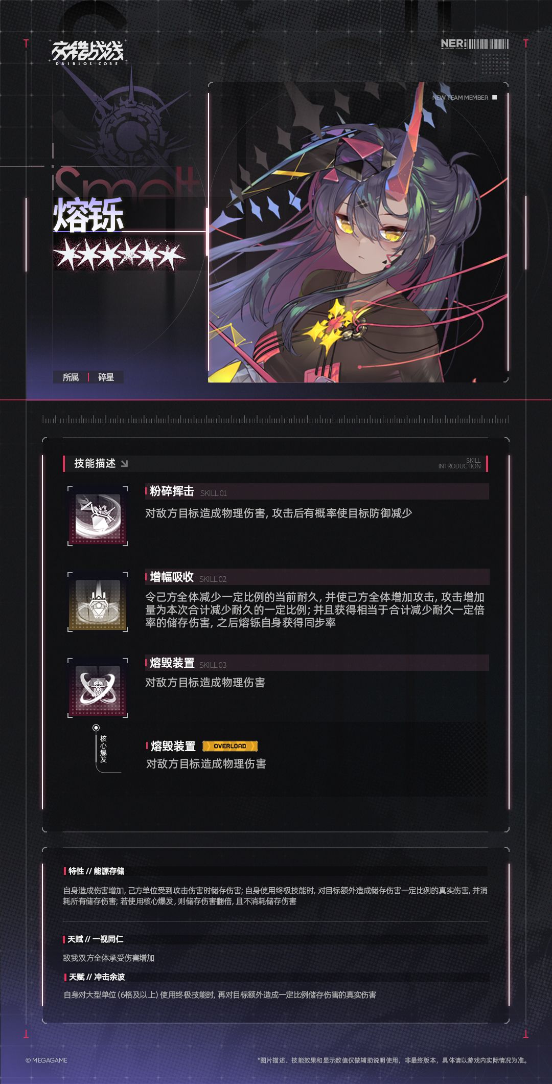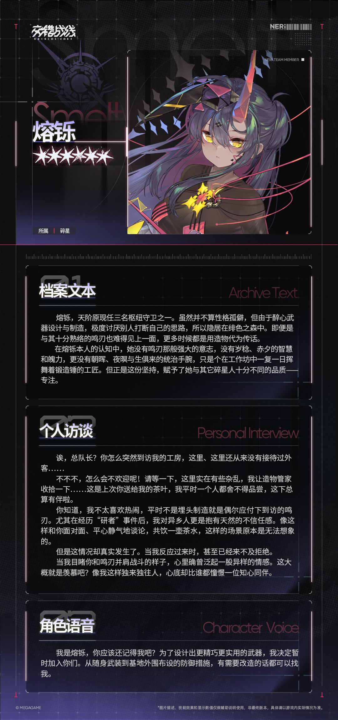 “我是熔铄,你应该还记得我吧?为了设计出更精巧更实用的武器,我决定暂时加入你们。从随身武装到基地外围布设的防御措施,有需要改造的话都可以找我。”