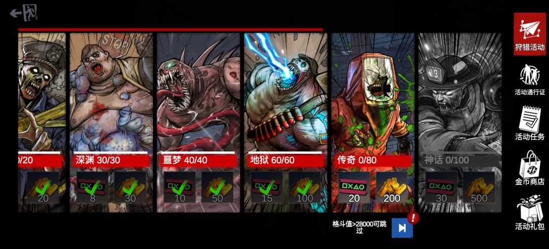 本期同样有章节快速解锁功能,可在章节选择界面直接跳过解锁本章,需要个人最高格斗值满足条件。跳过解锁时消耗的狩猎券和进入战斗消耗数量相同,除战斗本身的钞票奖励外,其他均可正常获得。