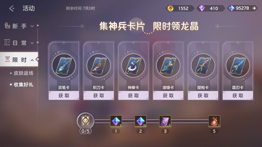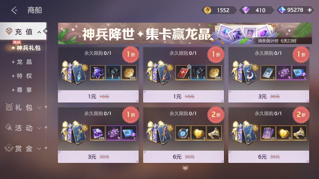 购买神兵礼包收集神兵卡片,即可获得神兵福袋、龙晶、寻宝签。打开神兵福袋必得皮肤碎片*10,有概率额外获得任一奖励:礼券*588、龙魂祈福卡*10、皮肤碎片*50。