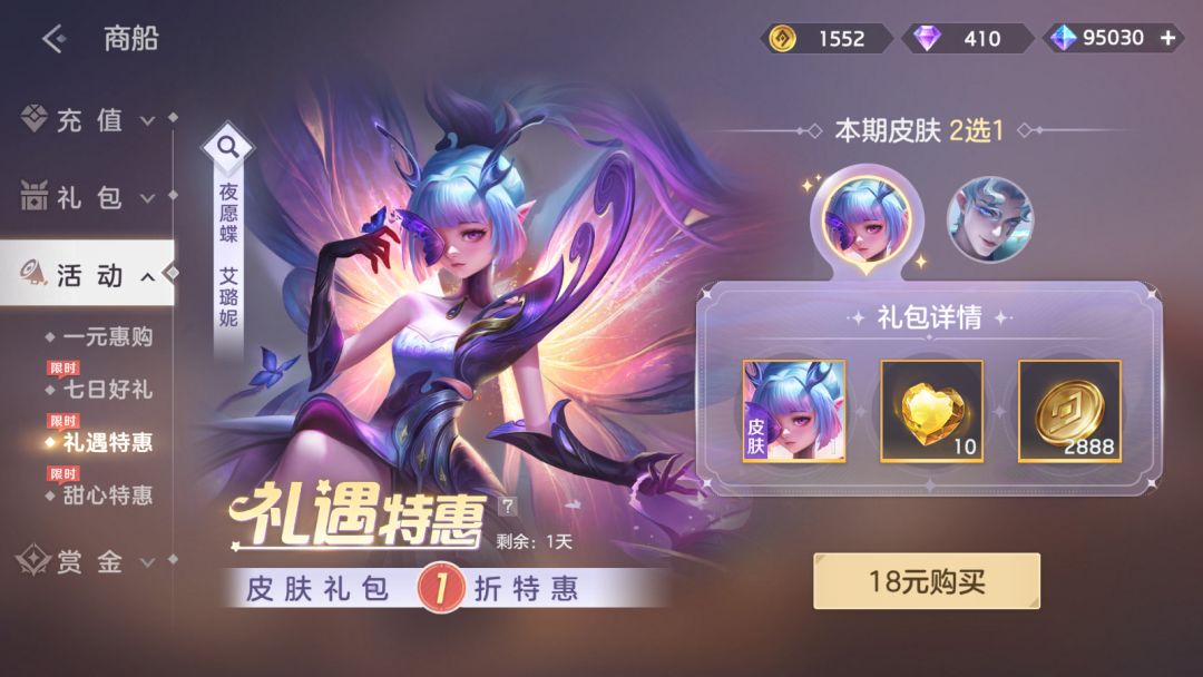 礼遇皮肤礼包限时1折,艾璐妮·夜愿蝶、伏羲·奇迹大师2选1!
