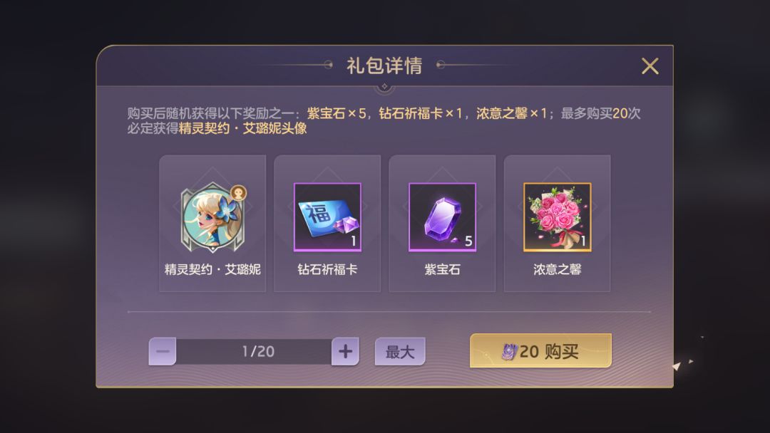 头像礼盒限时开售!使用礼券抽取精灵契约·艾璐妮头像、浓意之馨、钻石祈福卡等奖励,最多20抽可获得精灵契约·艾璐妮头像。