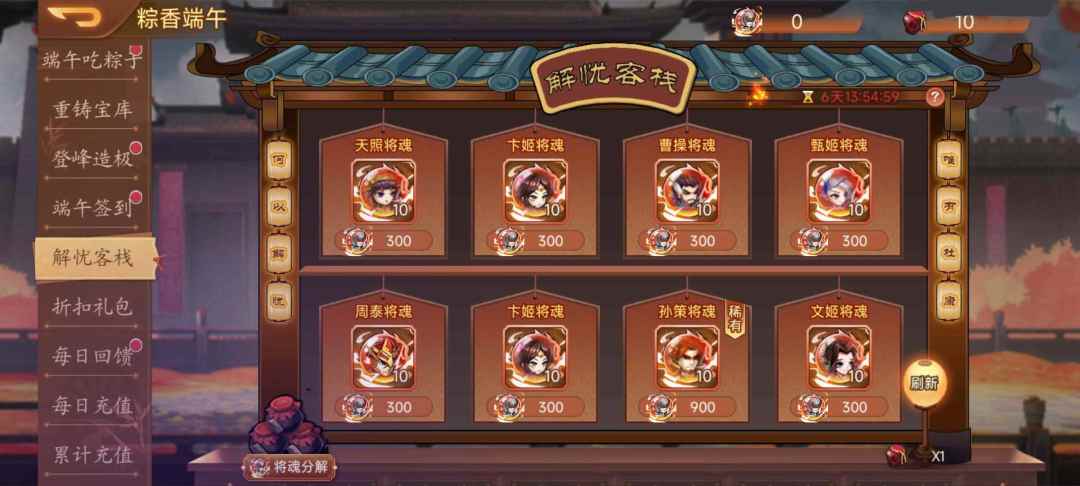 活动内容:活动期间,可通过【武将之魂】兑换将魂,可通过【解忧酒】刷新客栈的将魂,每天有一次免费刷新次数。