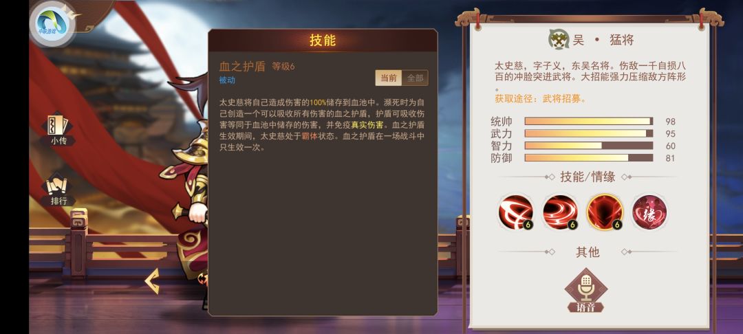 掌中三国中,有部分实力出众却被深藏的神将,今天先说说吴国的太史慈。笔者见过玩“一刀流”特别溜的玩家,其核心武将就是太史慈。笔者还是先行分析其技能情况,太史慈的三个技能分别为“以命搏命”、“致死打击”、“血之护盾”: