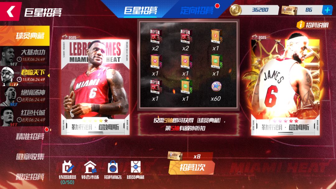 活动期间,可使用【典藏招募函】在【典藏招募-君临天下】池中,获取全新詹姆斯球员典藏。