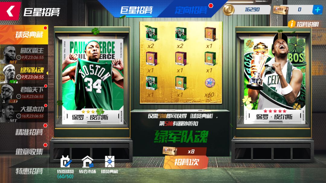 每次“抽一次”,则随机解锁一个奖励格,获取奖励格中的“球员典藏”或“典藏硬币”或“通用位置典藏”。至多抽取9次,成功将凯尔特人队皮尔斯球员典藏收入囊中!