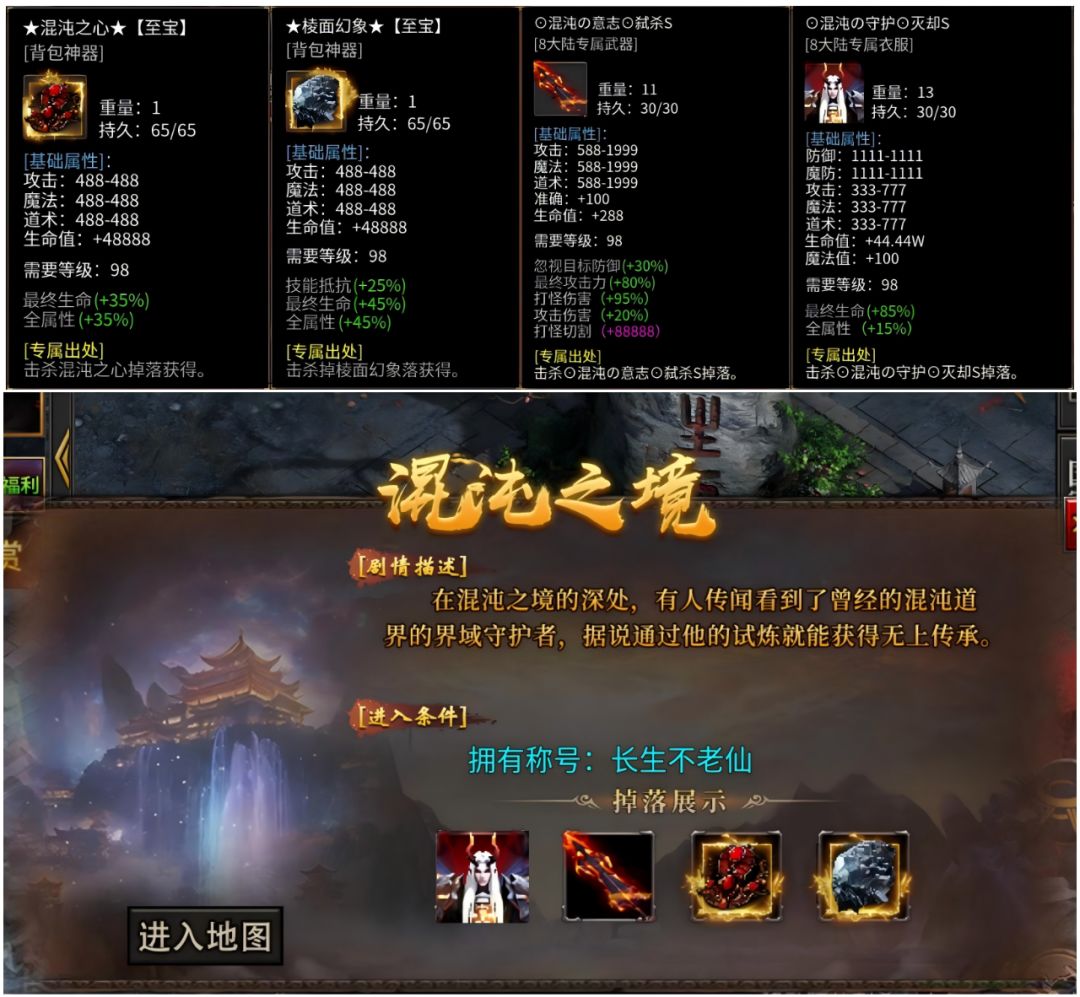 进入混沌之境,核心是挑战混沌道界的界域守护者,赢取超强装备(如混沌之心、棱面幻象等至宝,混沌的意志、混沌的守护等专属武器/ 衣服 ),以下分步骤拆解玩法: