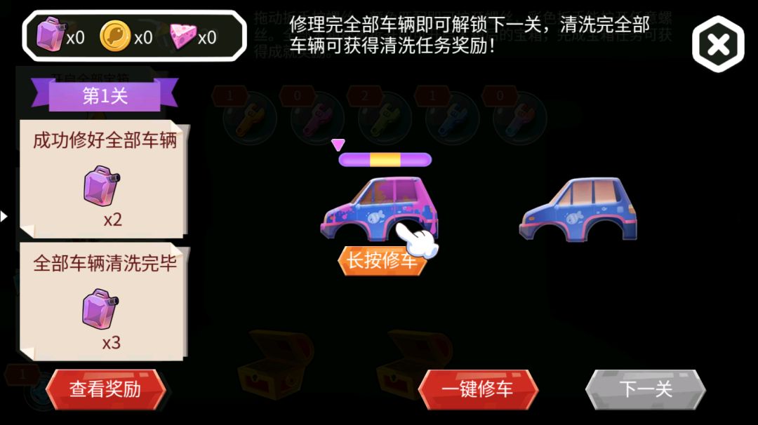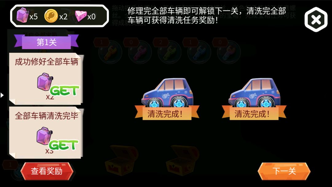 点击车辆,完成修车、清洗环节,收集汽油道具、小鱼金币、奶酪,完成后进入下一环节。