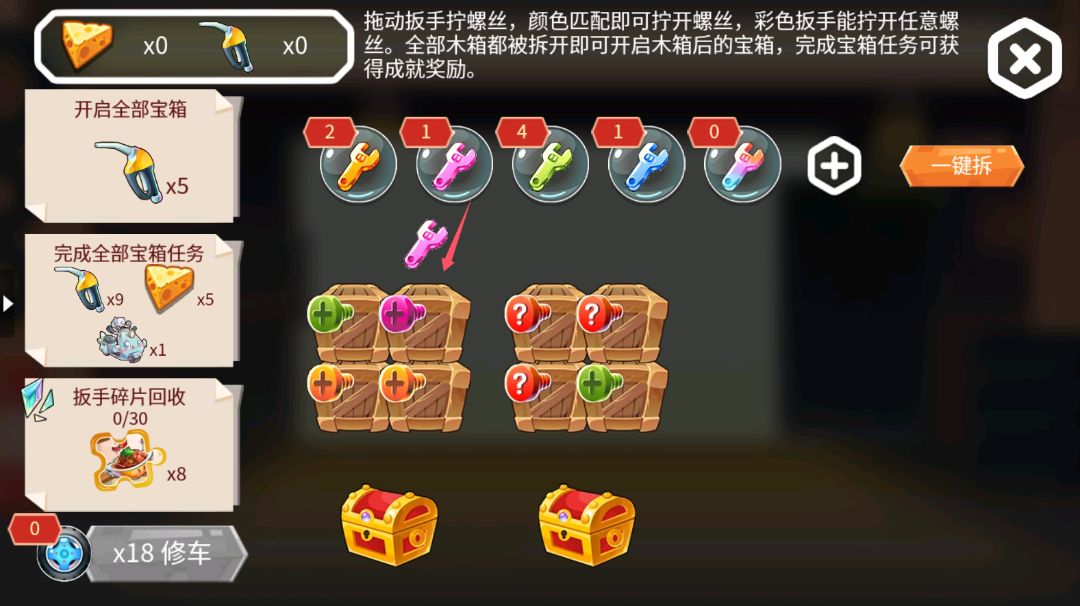查看螺丝颜色,将同样颜色的扳手拖动到对应颜色的螺丝上进行匹配,过程中收集道具、开宝箱。