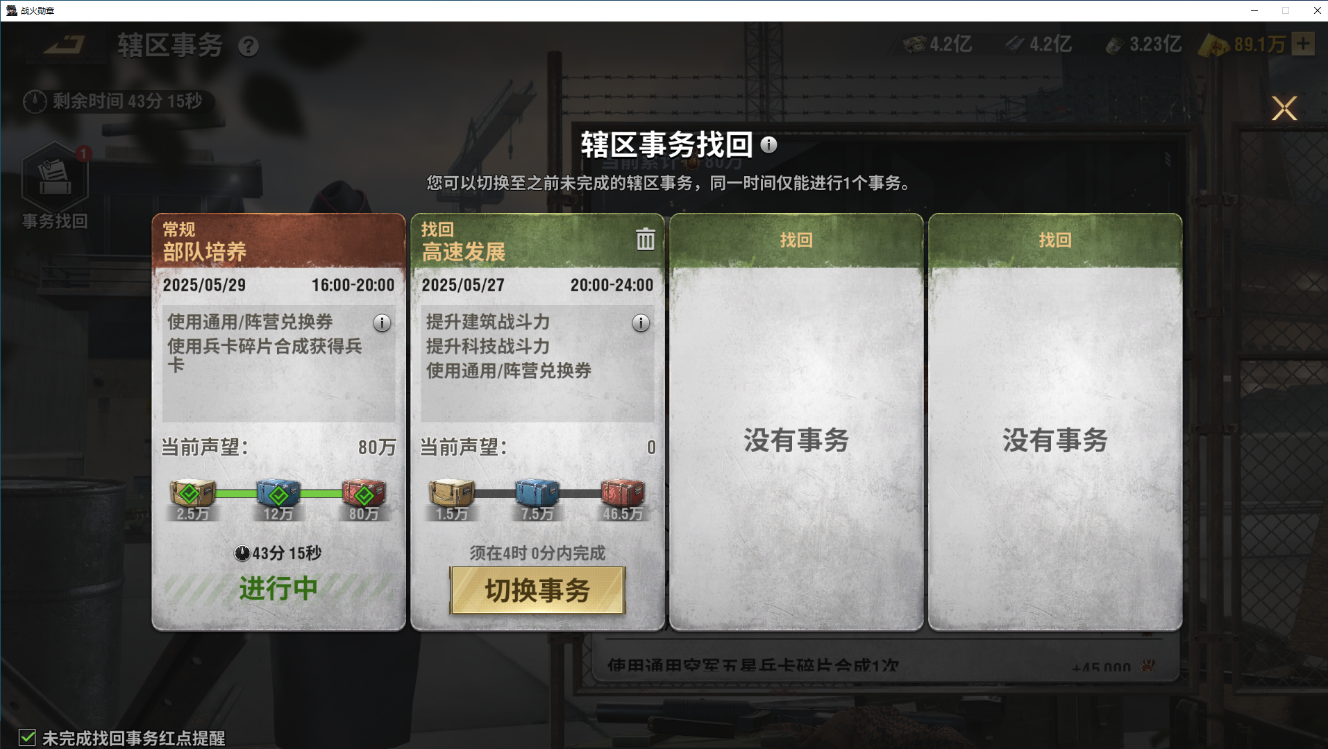 具体实施方法:在周四当天到来之前,周一、周二、周三,分别每天都有两个“高速发展”的辖区任务,我们要保存三个“高速发展”的辖区到找回栏里面,然后等到周四凌晨0点钟到来之后,除了将常规辖区“部队培养”的辖区任务做了的同时,也要把三个“高速发展”的辖区全部完成,这样既可以抽卡,又不会造成奖励资源浪费,一举两得,完成三个“高速发展”的辖区任务之后,大家就可以放心休息了,此时辖区找回栏已清空,不用担心4:00~8:00的辖区任务会丢失。