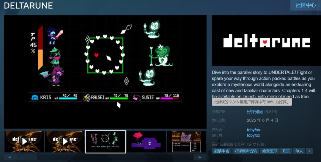 《DELTARUNE 三角符文》(以下简称三角符文)正式发售,售价98元,原声带售价58元,暂只支持英语和日语。
