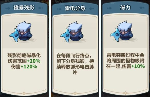卡卡推荐选择【磁暴残影】,【雷电分身】,【磁力】,以及【雷电强化】之类,来提升卡卡的持续伤害和伤害范围。