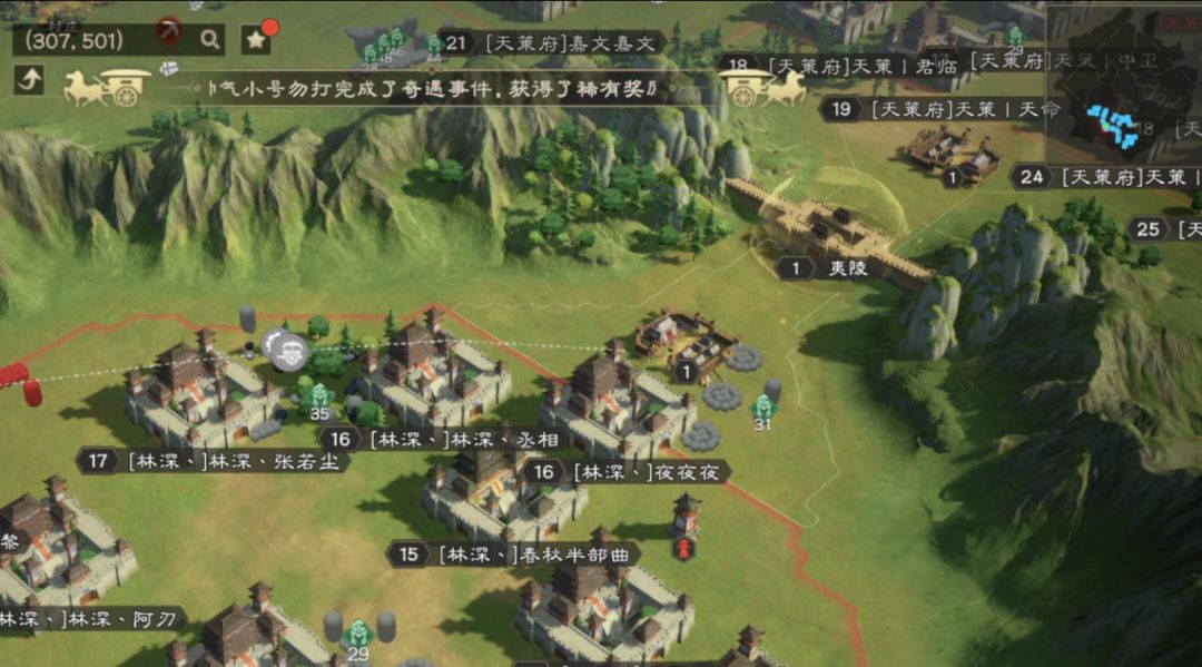 先看夷陵,同盟战力排行第五的【林深丶】在当日14:00就在此处落堡,同盟战力排行第三的【天策府】初时看似无动于衷,但在傍晚前集结众多成员落堡,双方于夷陵两侧对峙。