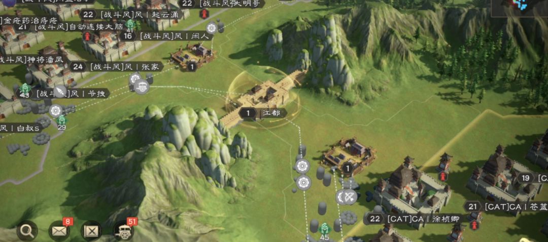 21:11【战斗风】建好攻城大营立马对江都发起冲锋,双方围绕兵种克制的特性不断调整攻城与守城部队的兵种,【战斗风】久攻不下,甚至一度被【CAT】反推出城。不过【战斗风】显然有着不到乌江不尽头的决心,于21:28拿下江都。