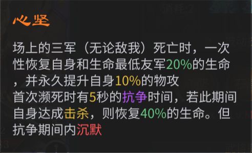 其专属一被动,是生存能力的体现。即使对手用三军作为炮灰来挡刀,也能使己方在之后的战斗中不落下风。而凭借濒死时强硬的保命能力,可放心的选择进攻型的套装和战魂。