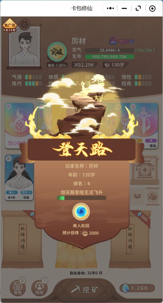 开局天赋:炼器+炼丹,仙术:炼器仙术+煅体/浴血/岩石,伙伴:剑/邪+长生+炼器/世家/行商,确保伙伴有剑或邪,保证能一直炼器回血,残血开卡的时候注意别点黑骷髅