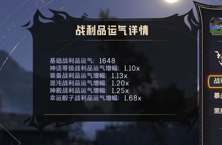 前期必做工作/少走弯路作为知名的刷刷刷游戏,我们游玩途中最重要的就是掉宝率,而这个游戏中叫做战利品运气战利品运气总指数=基础战利品运气×幸运骰子增幅×神殿增幅×神话等级增幅×装备战利品增幅×混沌增幅后面几个前期不用考虑,基础战利品运气是由等级提升而提升的,这个顺其自然,最需要关注的是幸运骰子和神殿增幅,特别是幸运骰子。