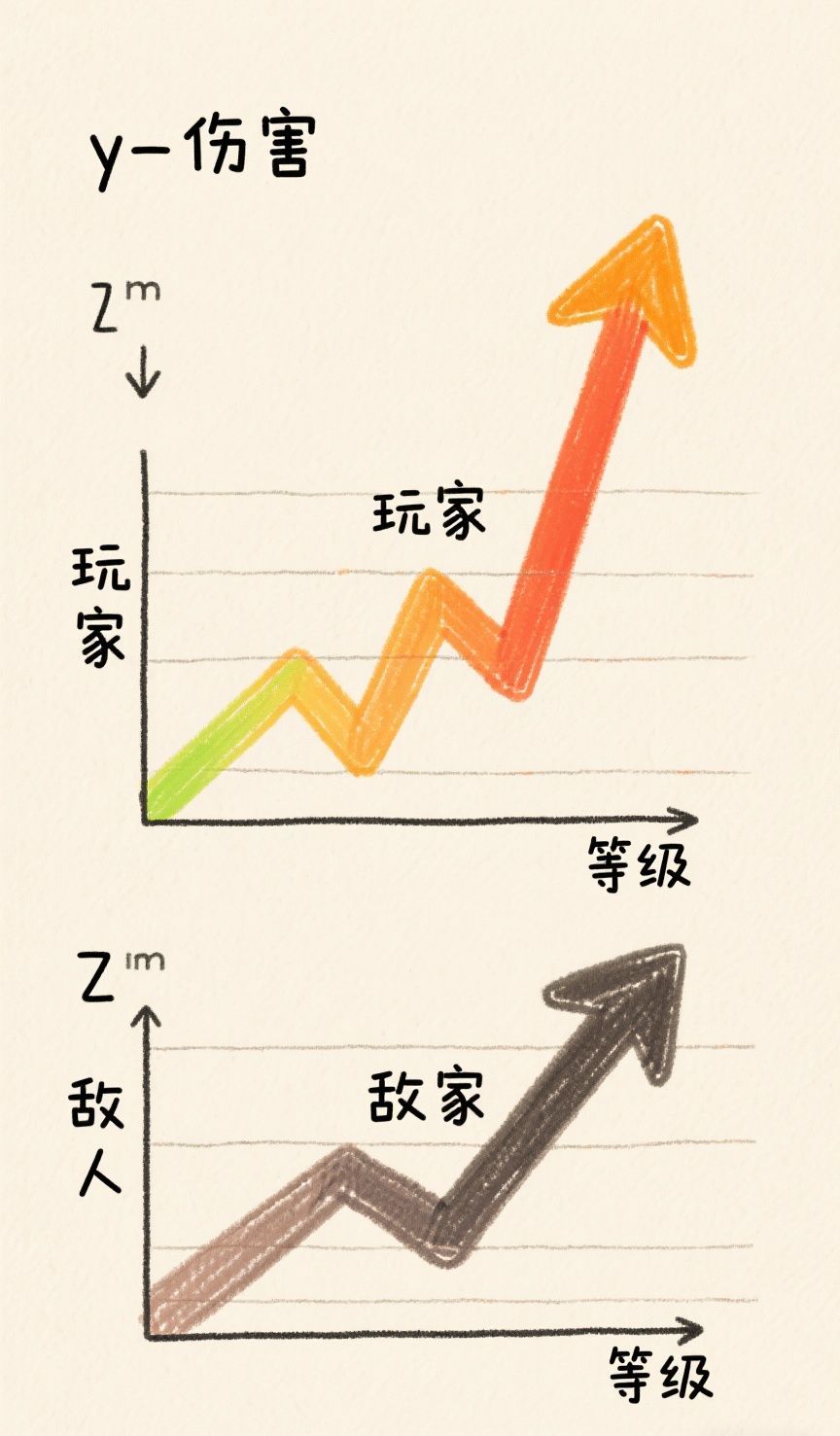 但不用担心割不了草这个问题,因为玩家的提升曲线是远超敌人的提升曲线的,毕竟我们是装备+等级提升,敌人是单等级提升,我大致绘制了一张图,大家看图片应该能明白锦鲤我的意思。