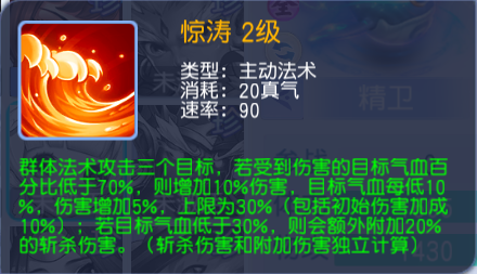 魔道增加惊涛的攻击目标数量(1)。这在日常和部分竞技场景中皆适用。仙道提升惊涛的技能效果(伤害提升并造成一定伤势)。显然仙道精卫主要用于竞技活动中,且适用的竞技场景较为广泛。