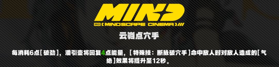 ●队伍存在[命破]、同阵营角色时,发动[断脉破穴手]对敌人施加[气绝]效果,使所有单位对其造成的伤害提升,持续10秒,重复命中可延长持续时间;