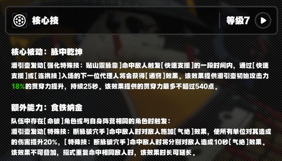●发动[强化特殊技]触发[快速支援]期间内,角色通过[快速支援]、连携技接战会获得[通窍]效果,可基于潘引壶攻击力按一定比例转化为贯穿力加成,持续25秒;