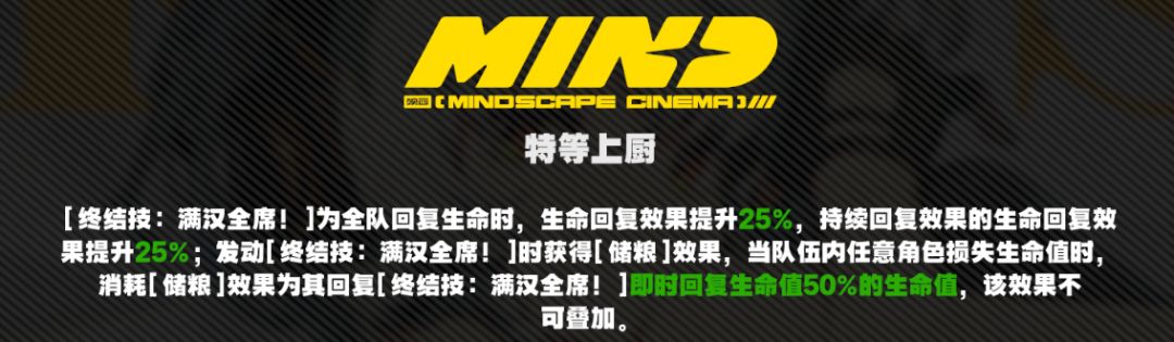 ●[终结技]为全队生命回复、持续回复效果提升25%,且发动时获得[储粮]效果,队伍中角色损失生命时,会消耗[储粮]对其提供[终结技]治疗量的50%,给低血线角色提供一个急救效果,在高压环境中提供容错率;