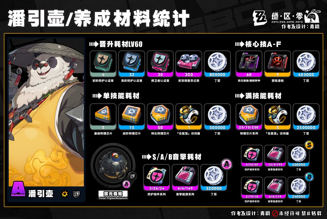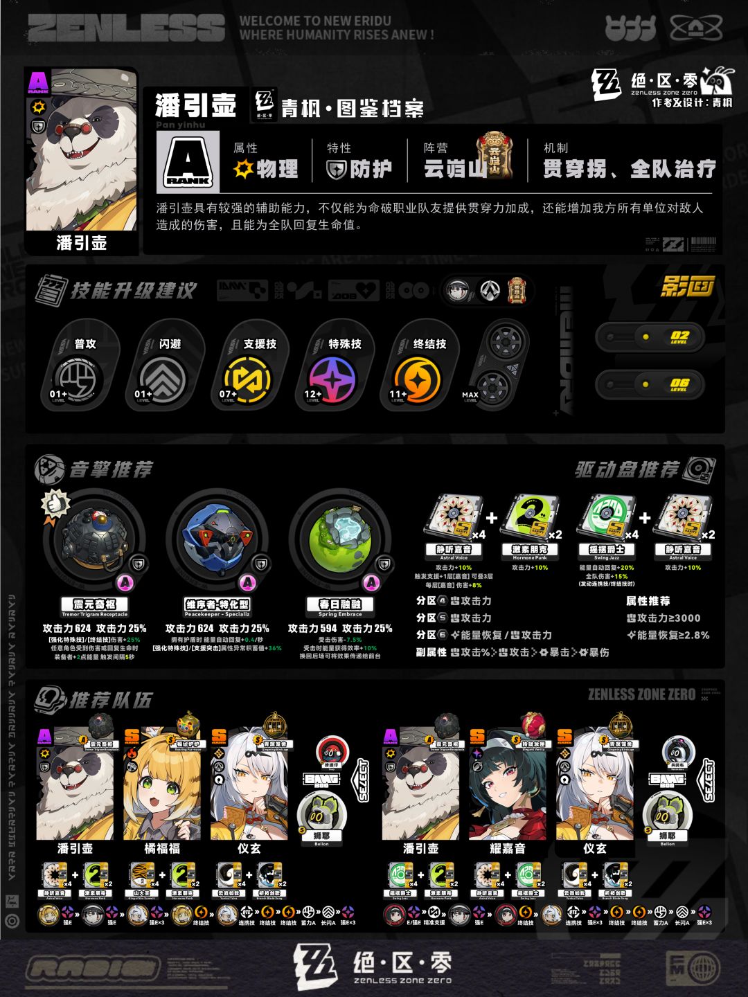 潘引壶--A级物理属性防护代理人,是一位2.0新贯穿体系中的专属辅助,通过速切发动[强化特殊技]即可轻松覆盖可观的贯穿力加成,并能够反向触发[快速支援]使输出角色快速接战,而自己则会自动留在前场打完点穴手,为敌人施加一定时间的增伤,[终结技]还可提供持续治疗效果,整体操作简单省心且不占用前场时间;
