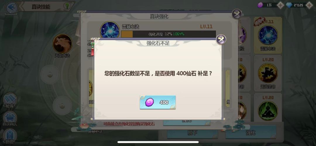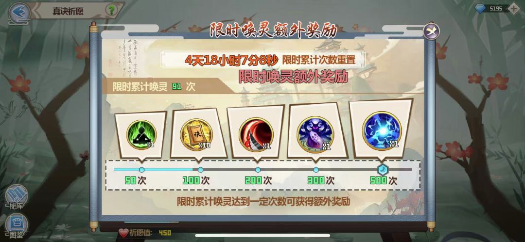 ps:这玩意其实前期基本就不考虑花,没囤个几万性价比都不高,除非有雷暴箱子的活动,或者下图真诀up每轮抽个50抽保底拿一个长生真诀(只抽每天3次打折的,780神石一次),需求挺大仙界战基本人手一个