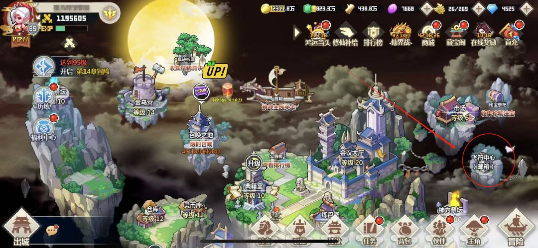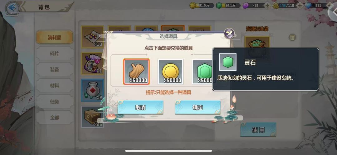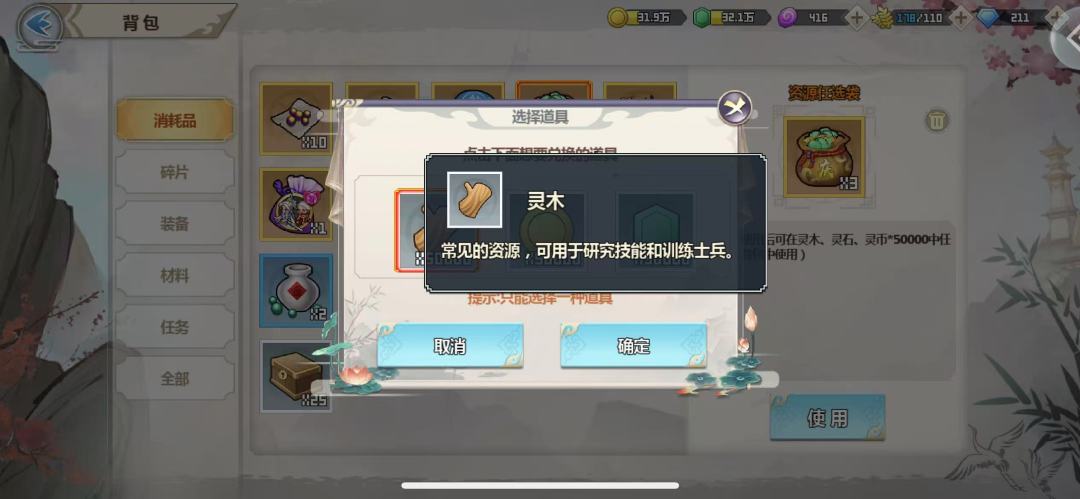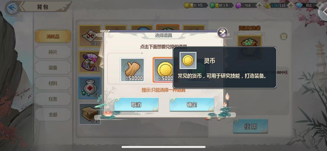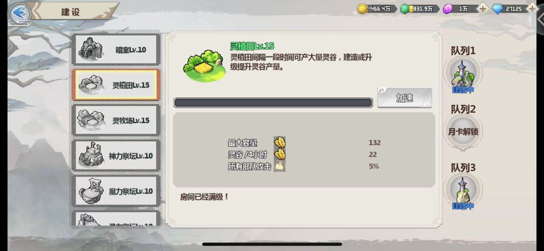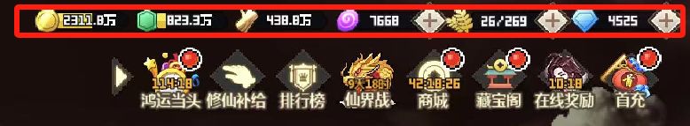 资源货币在主城页面右上角查看,从左到右依次是灵币、灵石、灵木、仙石、灵谷、神石