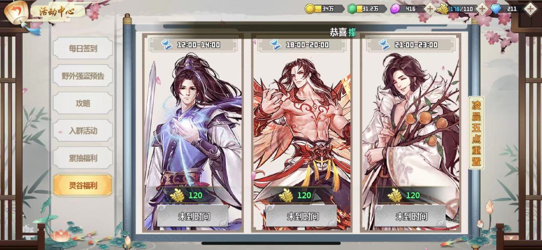 灵谷福利,每天12-14点、18-20点、21-23点之间,分别可以领一次,建议到点就抽空上线领一下,错过了也没关系,可以花20钻石补领