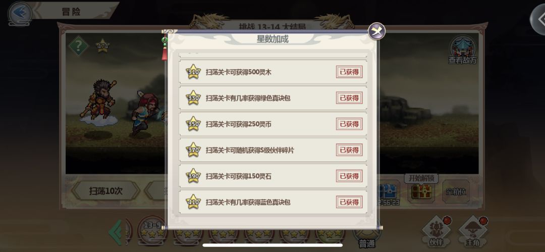 另外扫荡冒险模式之前要尽可能把每个关卡都打满星,或者都先打通关一遍,再去扫荡,因为通关的星星数量会影响扫荡的奖励,简单来说就是星星越多奖励越好,另外扫荡尽量只扫精英跟挑战模式