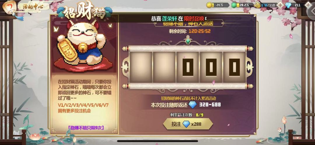 再次提醒首周不建议花,除非招财猫最后一天了确定没办法再多摇一次,再考虑花掉