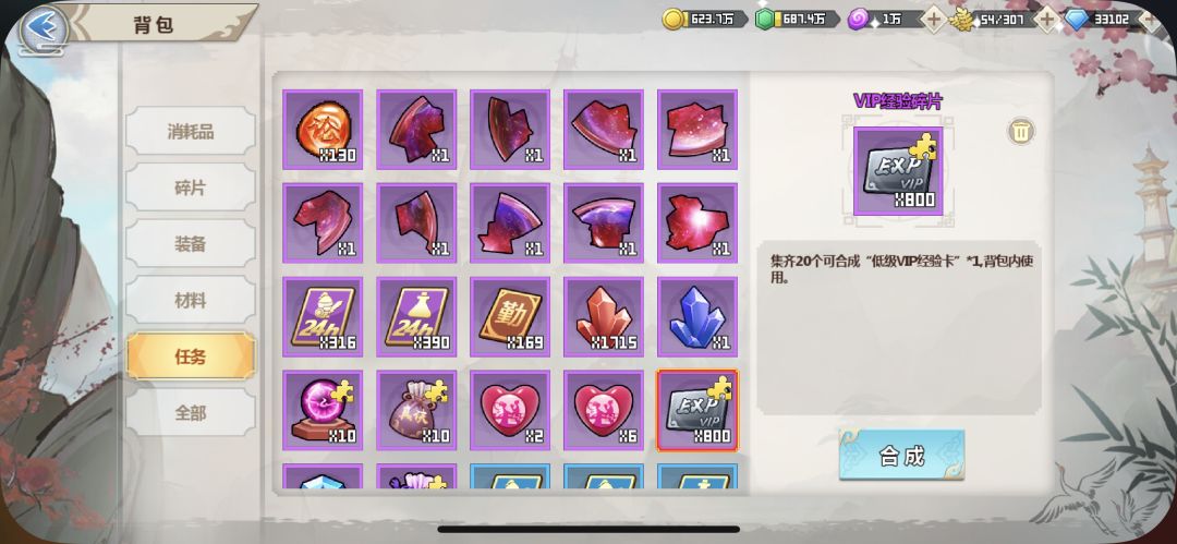 (ps:选了vip经验之后记得在背包→任务,里合成碎片再使用,不然等于没有,另外前期还有很多道具都是这样的碎片,需要合成才能使用,所以没事多检查一下背包,说不定还有惊喜~)