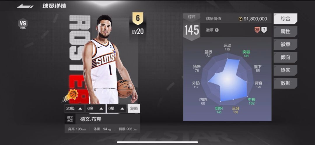 作为菲尼克斯太阳队的当家球星,德文・布克以198cm 身高 + 203cm 臂展的标准分卫体型,在 2K 手游中化身「进攻端的达芬奇」。2025 年综合能力值145的他,凭借射程无限 + 银空隙猎手的顶级投射徽章,在全明星赛中展现了从三分线外到篮下的全射程得分能力。其133 三分属性 + 162 中距离的面板数据,搭配库里背运包 + 科比式后仰的动作包,堪称「王朝模式的战术核心」与「街头局的单打杀器」。