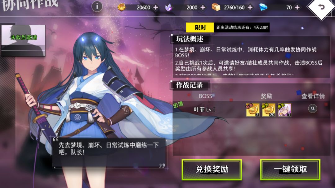 在梦境、崩坏、日常试炼中,消耗体力即有概率触发协同作战BOSS,每个玩家同时最多只可触发1个BOSS。BOSS有挑战时限,触发BOSS后开始倒计时。