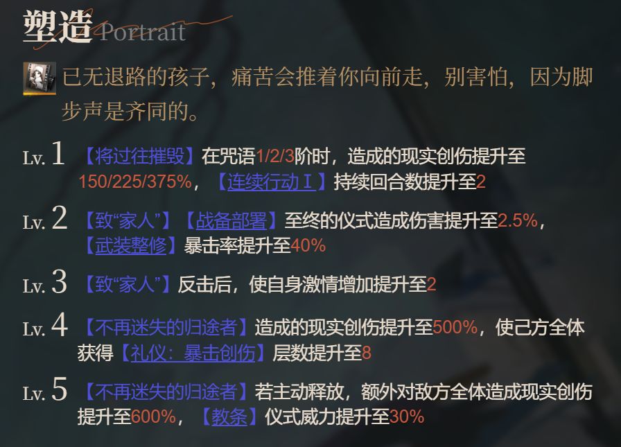 - 4塑:大招倍率提升,我方全体获得的【礼仪暴击创伤】层数提升