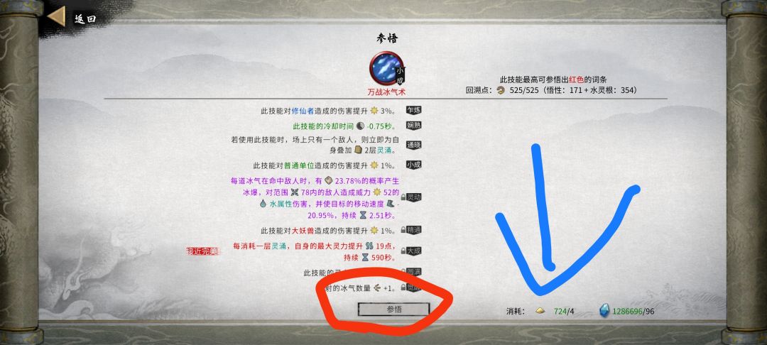 你前面修炼解锁了的词条这个时候就能洗点了,点击参悟解锁的词条就会变了,蓝箭头指的是需要消耗的东西(当宗主这些材料全能白嫖不然还得做任务买或者自己去打)