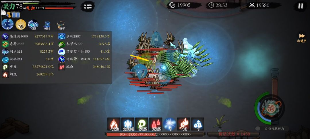 4.水系和木系每分钟伤害翻倍,最高200倍,8分钟可以叠满(其实木系能打伤害的也就木弩了,还有个小瑕疵,不加中毒伤害)