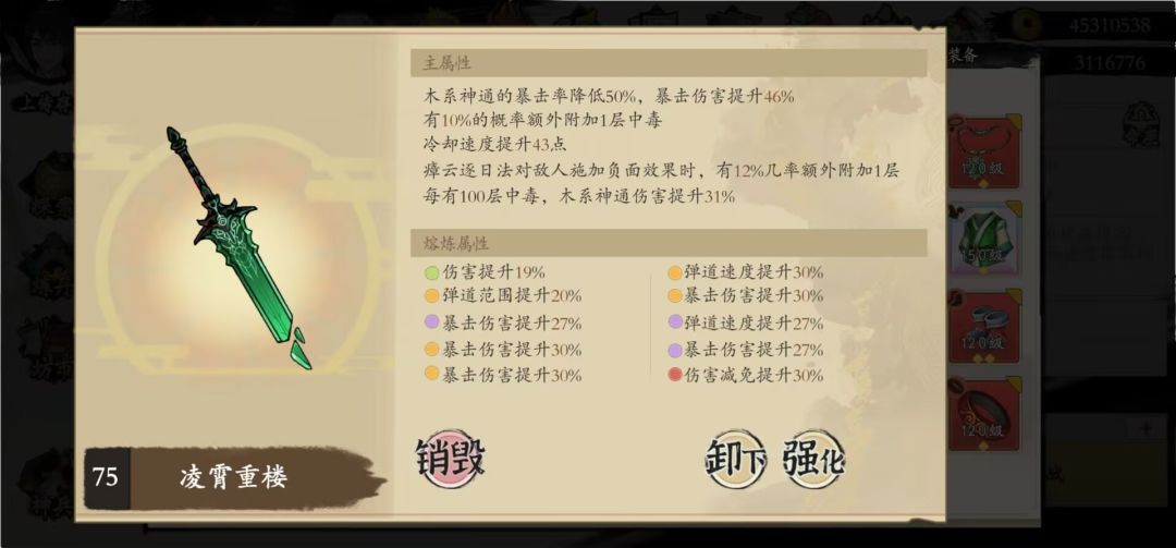 本命:由于木弩持续30s且必定暴击,所以“空”部位可以选择“劈地空”,熔炼推荐2条减伤,2条爆伤。然后炎龙吃弹道速度(上限200%)炎龙可以叠中毒,还需要熔炼弹道速度,另外可适当熔炼cd(飞叶快刀和玄冰术快一点)