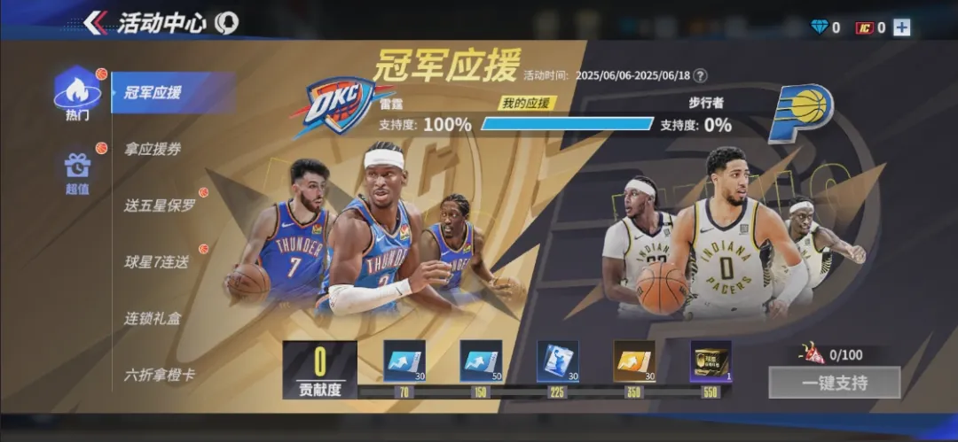 6月6日活动开启后,在【活动-热门-冠军应援】直接pick你支持的队伍(步行者/雷霆)!