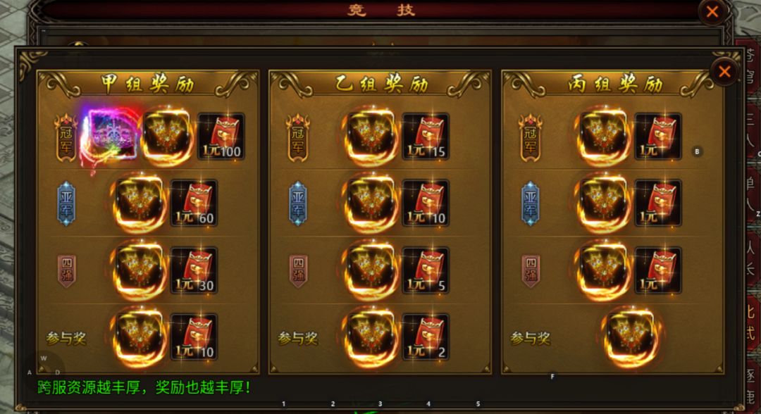 4、各职业通过四强赛、半决赛、决赛来决出冠军,奖励在活动结束后发放(跨服组资源越丰厚奖励也越丰厚)