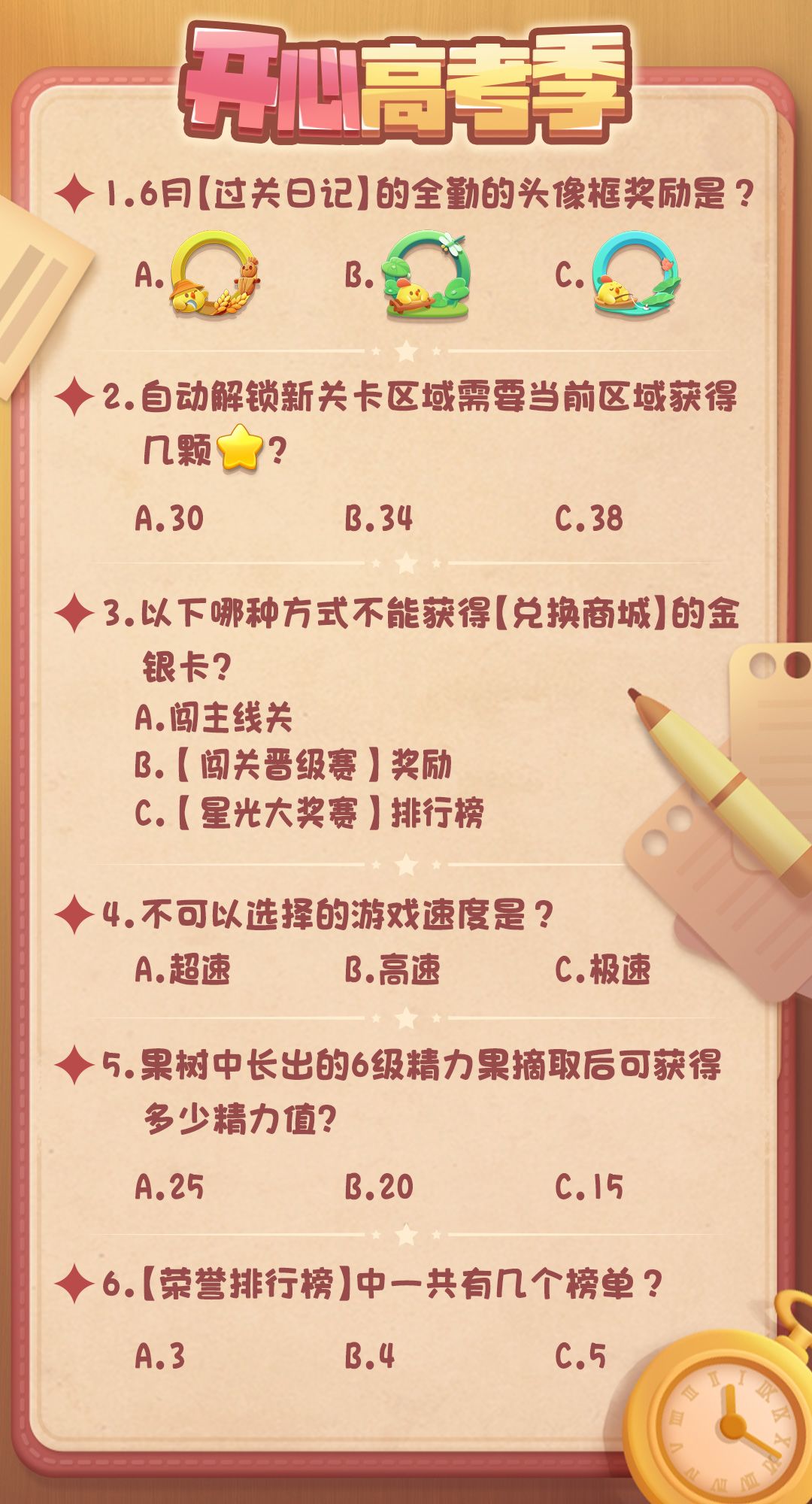 又是一年一度高考季,开心村的测试也如期而至,今年依旧为各位小村民准备了“消消乐高考题”,涉及游戏内各种各样的活动知识,考验大家消消乐游戏熟悉度的时候到啦!一起来试试看是否能够成功拿下满分吧ヾ(◍°∇°◍)ノ゙