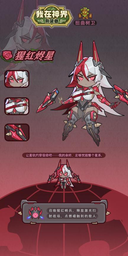 皮肤效果预览:新增攻击方式-猩红哨兵,每攻击5次后召唤猩红哨兵,哨兵可持续一段时间扫射战场。皮肤星级提升后,可增强猩红哨兵的攻击效果,星级达到3星后局内可初始获得【滚木伤害增幅】【致残滚木】【滚木急行】其中一张卡牌。