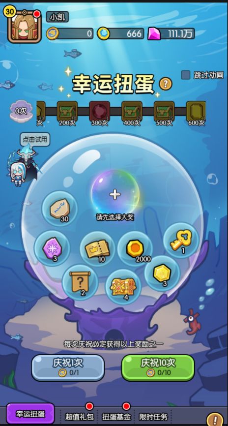 3)每消耗1个扭蛋币抽奖,可积累1点幸运值。不同的大奖对应不同的幸运值,幸运值满必得大奖。抽到大奖后,幸运值清空重新积累(包括提前抽到大奖)。