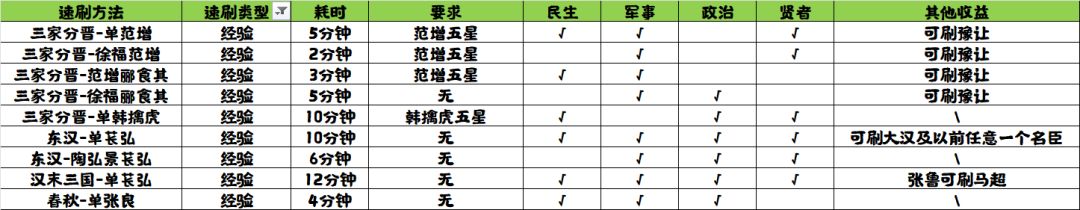本文刷法耗时10分钟,可刷民政贤经验,要求韩擒虎五星,为东汉-单苌弘的下位刷法(少刷一个军事位),稳定性一般。下文简述步骤:1、三家分晋剧本,选择魏势力,难度建议为普通或自定义,携带韩擒虎及需要刷...
