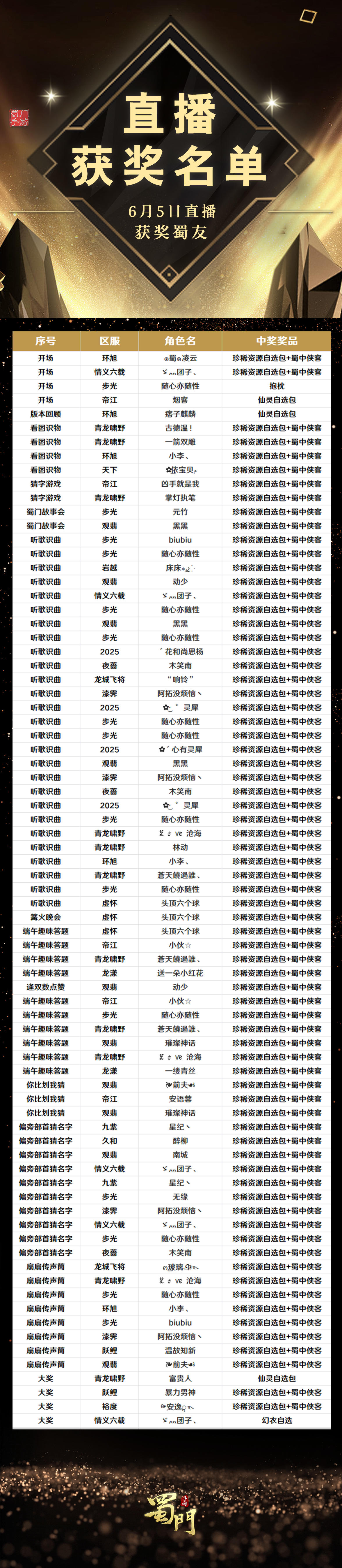 本次直播也送出满满的福利!这次是以下幸运的蜀友获得的奖励,恭喜各位~这些奖励都是在直播间实时送出,下次直播我们还在直播间等你~