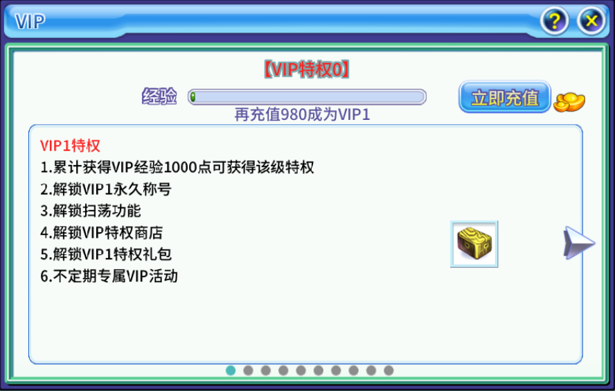 游戏内每储值1元即可获得1点VIP经验值,经验值达到等级需求时即可提升至对应的VIP等级,即可在此页面解锁vip相应等级并领取相应vip专属礼包