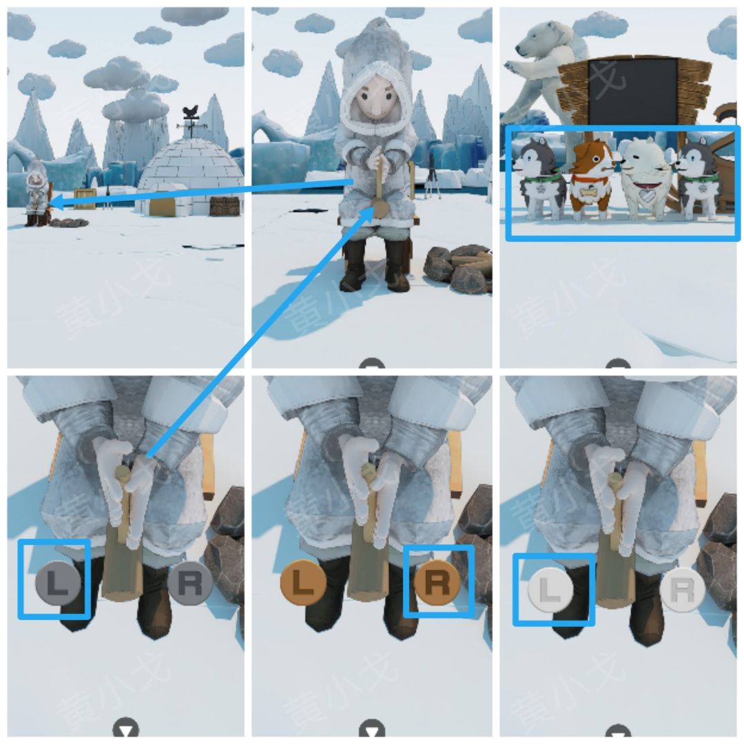 13.点击男人手上的钻木,根据按钮颜色,结合[北极熊]场景狗狗的颜色及脸部朝向线索,按下正确的按钮